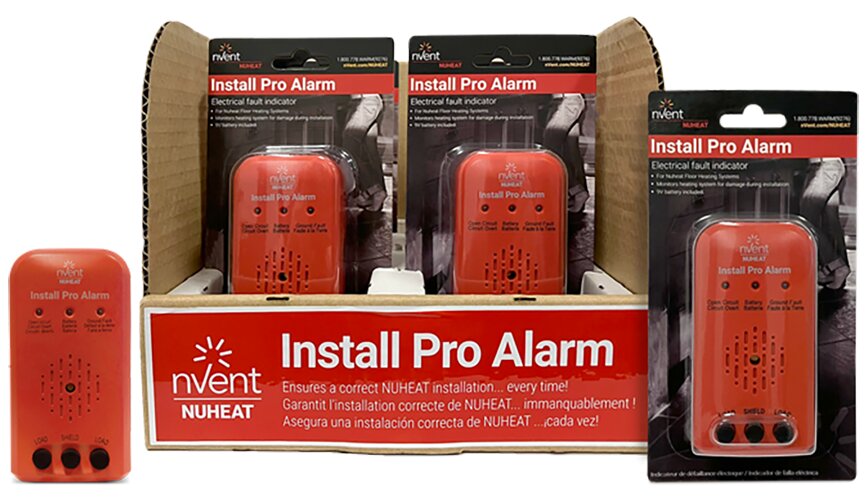 Nuheat Install Pro Alarm (AC0200) is an electrical fault indicator that simultaneously monitors the hot, neutral and ground wires during installation of any line voltage floor heating system. If a wire is damaged during installation, the Install Pro Alarm will sound an alert, prompting the installer to stop and correct the problem before continuing.